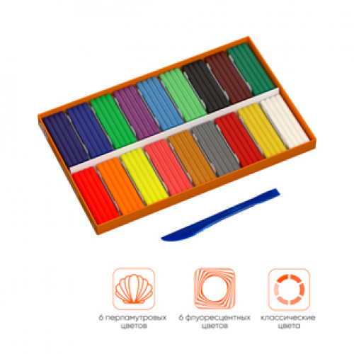 Пластилин Оранжевое солнце, 18 цв. (6 классич., 6 флуор., 6 перл.), 234г, со стеком Гамма